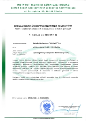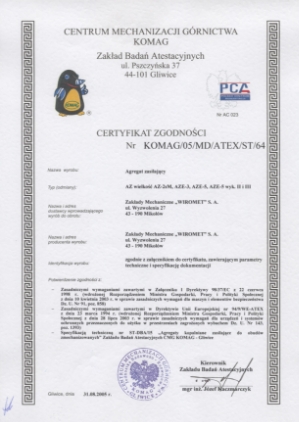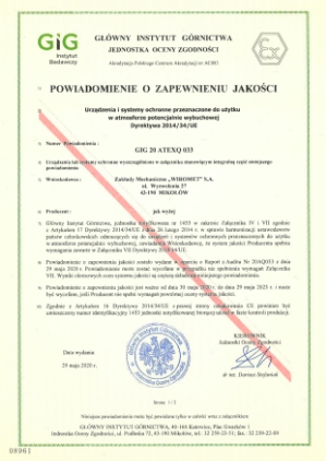 issued by the Certification Body – Central Mining Institute – for protective equipment and systems intended for use in potentially explosive atmospheres. Notification No.: GIG 20 ATEXQ033